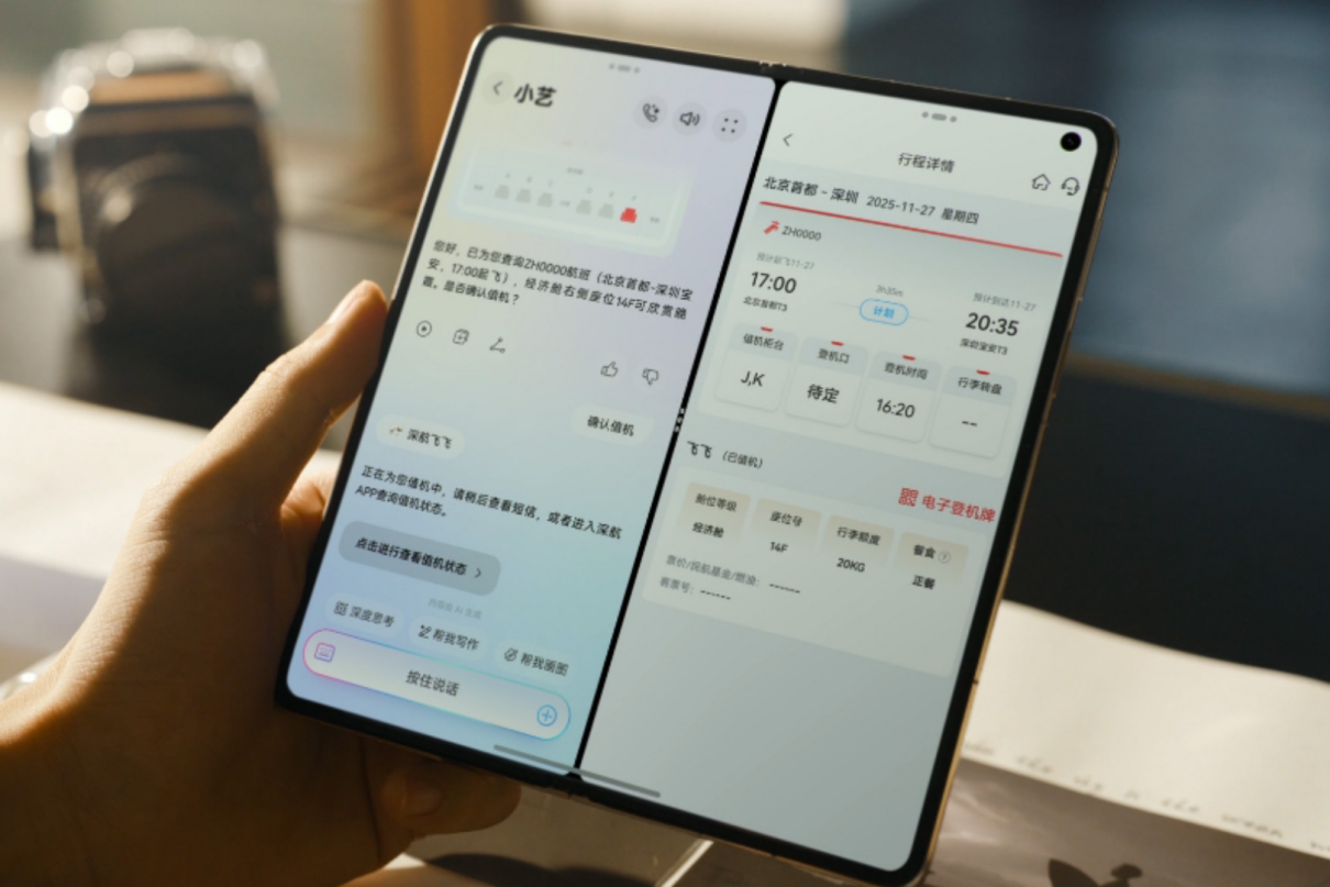 折叠大屏不只是为了好看,更是为了好用。家人围坐在一起,展开华为Mate X7看春晚回放、刷短视频、看电影——8英寸的沉浸视野,让欢声笑语更加浓郁,氛围感瞬间拉满。在平时生活与工作中,智慧分屏功能让效率倍增:一边浏览资料,一边记录笔记;一边视频会议,一边查阅文档,多任务并行从容有序。此外,只需简单的语音指令,小艺便能帮忙完成买票、购物、查攻略等一系列操作,这正是华为折叠屏所能带来的差异化智慧体验。